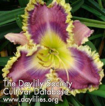 | Description : Fuchsia with large, irregular violet eye over pale gold to chartreuse throat, large, pale creamy white toothy edge, sometimes hose-in-hose form, or extra petaloids. | |