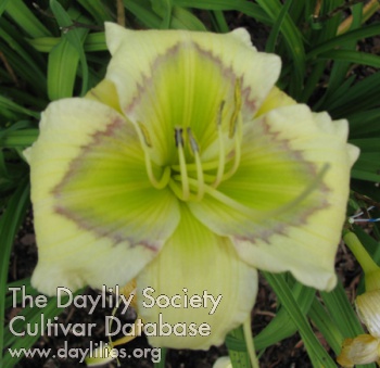 | Description : Buttercup yellow with large, purple blue eye with petals and petaloids edged in amethyst and sky blue lavender. | |