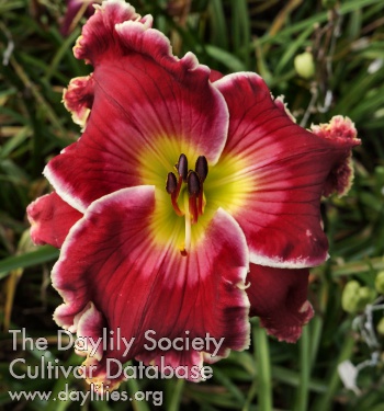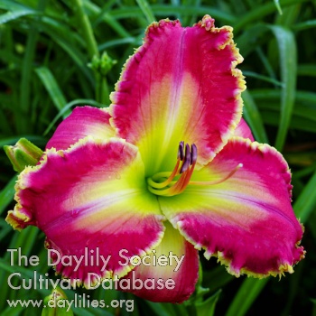 | Description : Dark pink with a lighter pink watermark, golden yellow edge can have some teeth, green throat. | |