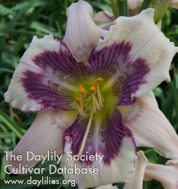 | Description : canvas petaloids with very complex eye, thin picotee edge and green throat | |