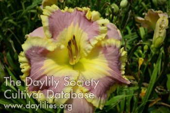 | Description : Purple with bluish white watermark, large green throat, and lemon lime ruffled edge. | |