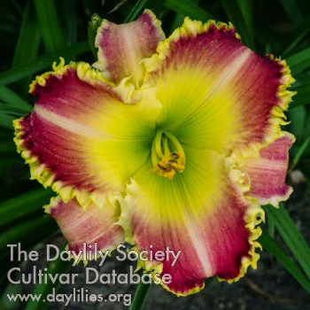 | Description : Salmon pink edged with chartreuse shark's teeth, with a green throat. | |