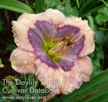 | Description : wine purple with patterned eye of blue purple and violet above whitish green throat | |