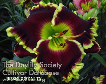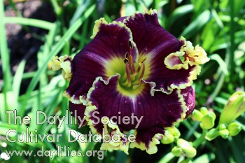 | Description : Charcoal black purple with long ribbing on petals, ruffled dark yellow gold edging above a green throat. | |