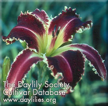 | Description : Burnt maroon bitone with blushed yellow sepals, white midribs on petals, large yellow shark's teeth and curled hooks on petals and sepals, small yellow over chartreuse throat. | |