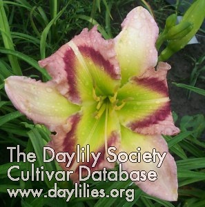 | Description : maroon purple with darker maroon purple eye and edge ruffled in white above green throat | |