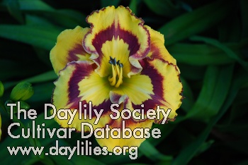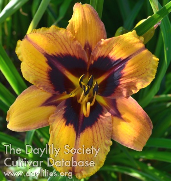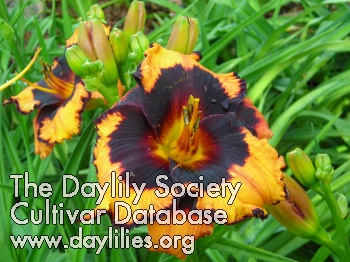 | Description : Bright orange yellow with dark purple eye and border, appliqued throat with a patterned layer of purple which is bold, infused or nonexistent dependent on temperature. | |