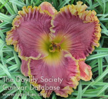| Description : Cream with baby pink blush, green throat with extensive sculpting, and large, bright gold edge. | |