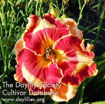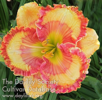 | Description : gold with bright orange eye and inner edge, gold outer edge, overlapping full form flowers | |
