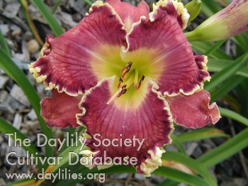 | Description : cranberry with darker cranberry eye, ivory edge, yellow to green throat | |