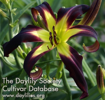 | Description : wine red with a green throat, eyezone is patterned in a rainbow of broken colors, one of which is a bold fluorescent band | |