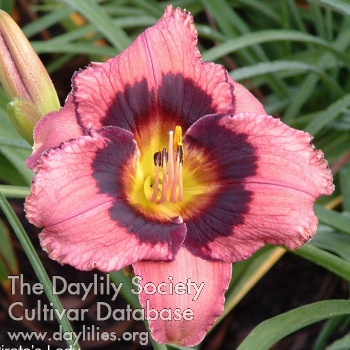 | Description : dark lavender with plum purple eye and edge above yellow green throat | |