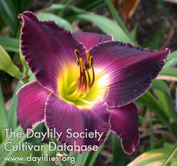 | Description : reddish grape with light gray violet eye and white edge above creamy lemon to green throat | |