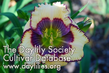 | Description : cream white base with dark purple eye and picotee edge above green throat | |